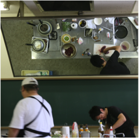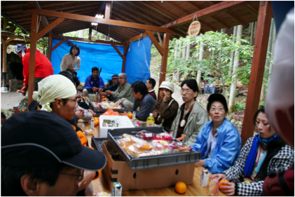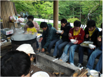雨天で太鼓広場が使えないため、山荘の東屋にて朝食