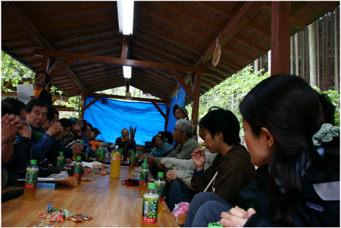 あいにくの雨で太鼓広場が使えないため、山荘の東屋にて開催